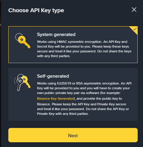 💡 Tip: System generated keys are easier to manage and more secure for automated trading bots.