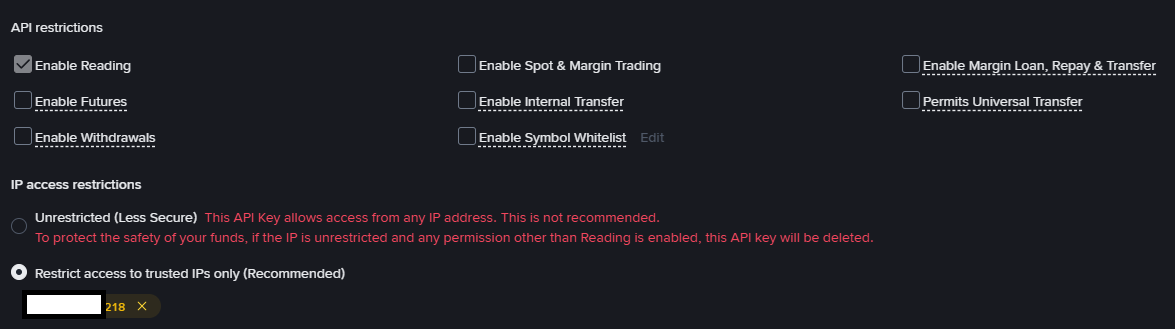 💡 Important: IP restriction is REQUIRED to enable trading permissions. Without it, you can only use reading functions.