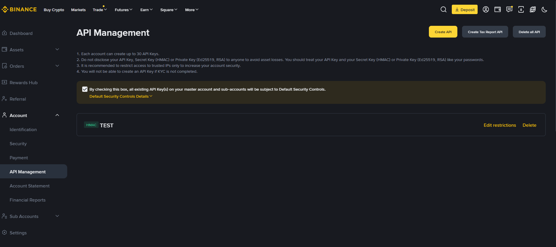 ⚠️ Security: 2FA is required for API creation to protect your account from unauthorized access.