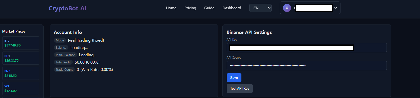 ✅ Connection Successful! Your Binance account is now connected to CryptoBot AI. You can proceed to configure your trading settings below.